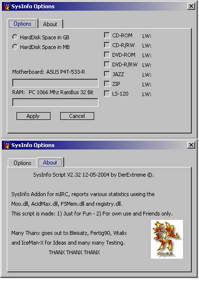 SysInfo Addon for mIRC, reports various system information using: Moo.dll, AcidMax.dll, FSMem.dll and Registry.dll.This script is made: 1. Just for fun - 2. For own use and friends only.